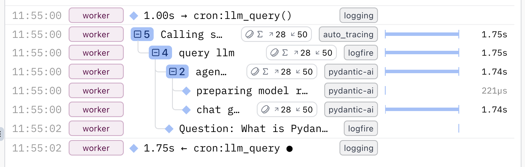 A span is the building block of a trace. You might also think of spans as logs with extra functionality — a single row in our live view.